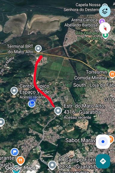 📍 Área localizada com frente de 60m para a Estrada do Mato Alto e 80m para a Estrada Aterrado do Rio. Por ter 2 frentes, tem boa indicação para mercados, atacadões, galpões e muito mais...